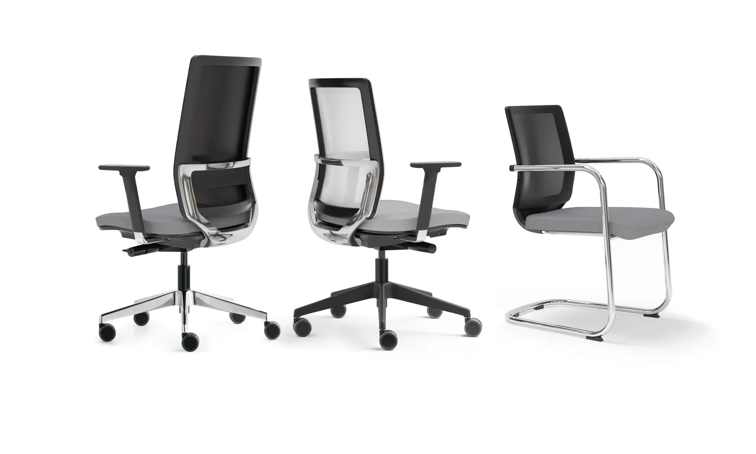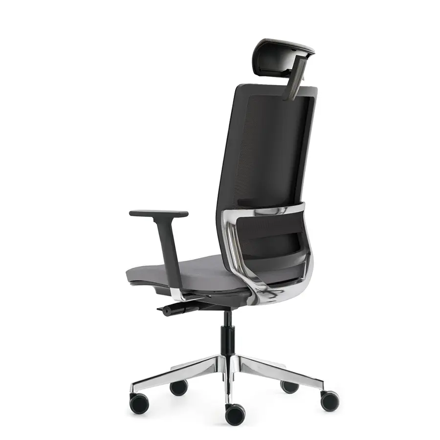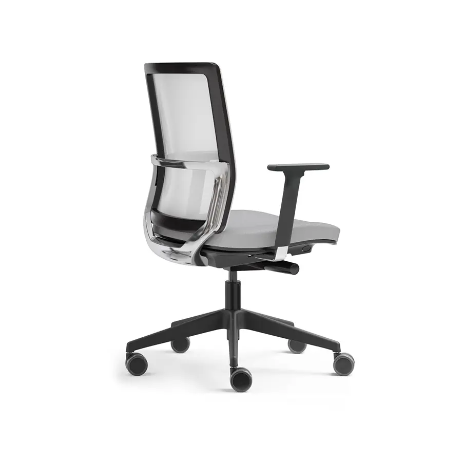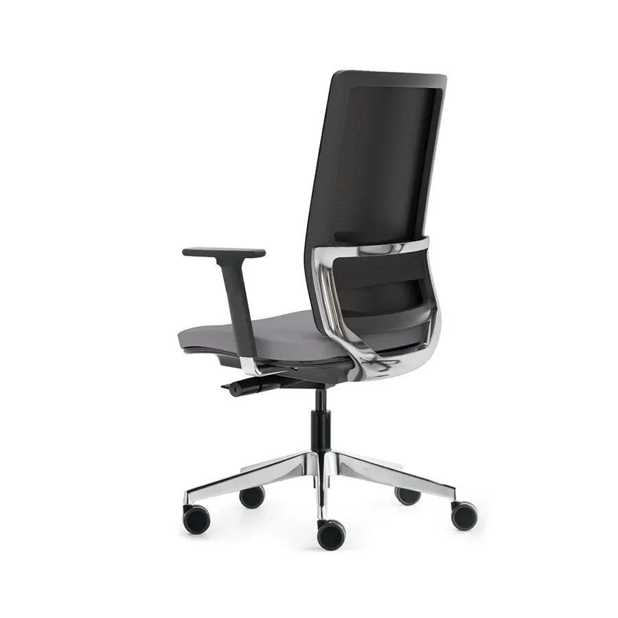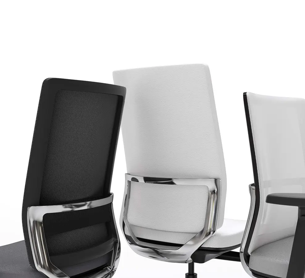 Rectangular con bordes y vértices redondeados. Estructura de poliamida y polipropileno inyectados. Tapizado con malla Meci o 3D transpirable (opción malla) o recubierto de espuma inyectada con 70 kg/m3 de densidad y tapizada (opción tapizada). Las dos versiones de malla incluyen la opción de regulación lumbar accionada desde la parte posterior. El respaldo se soporta en un marco de aluminio pulido.