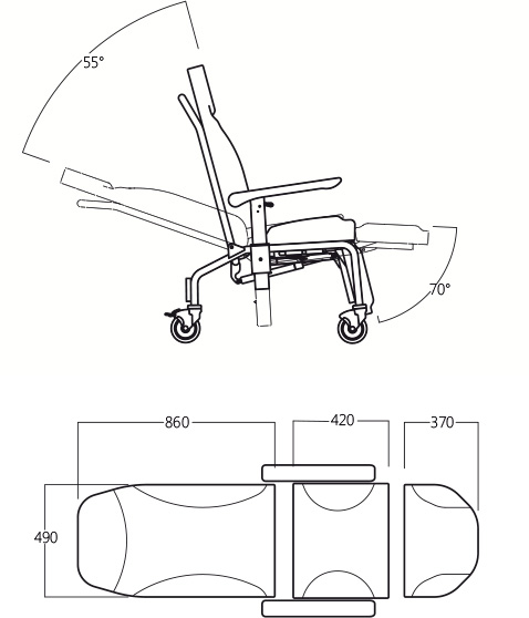 - Respaldo y reposapiernas abatibles de forma independiente por resortes de gas actuados por palancas laterales