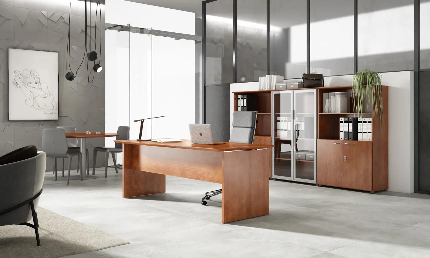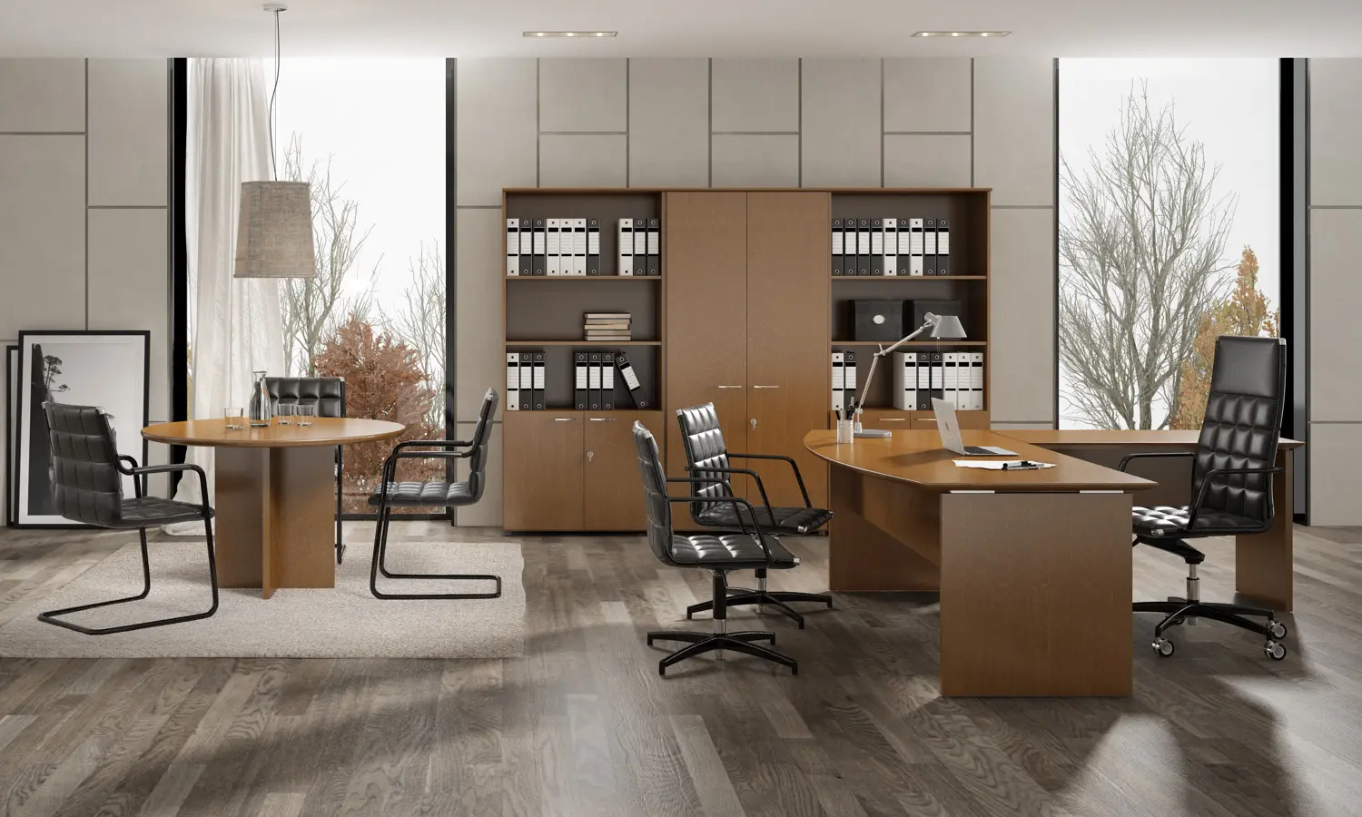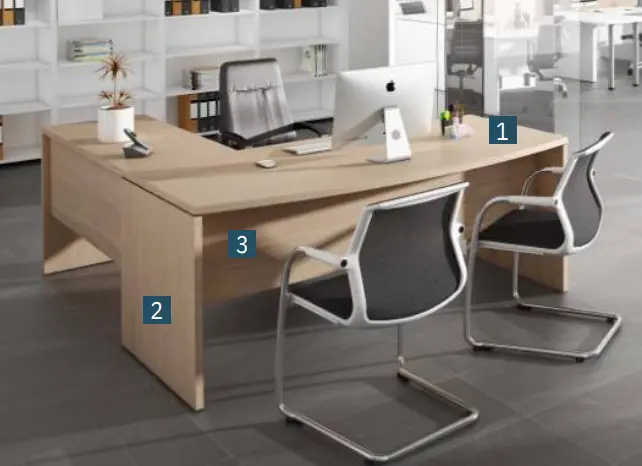 - Costados fabricados en tablero MDF de 31 y 40 mm de espesor rechapada en madera natural barnizada con barniz poliacrílico respetuosos con el medio ambiente y terminación UV. Cantos rectos chapados en madera natural en todo su perímetro. La unión de los costados con la tapa de la mesa se complementa con arandela de poliamida antivibraciones de 7 mm de espesor y se remata con el suelo con deslizantes de poliamida de 7 mm de esesor.