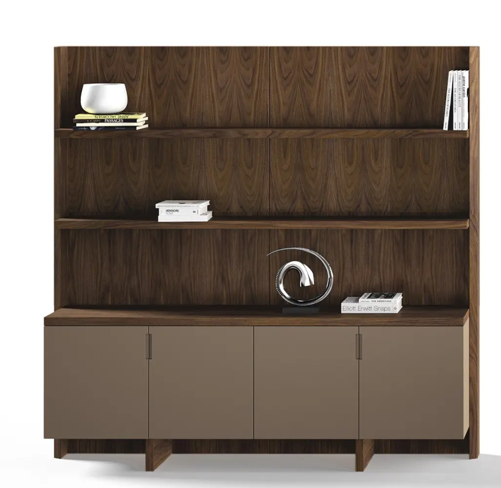 - Cuerpo de la librería realizado en tablero de partículas de MDP de 620 kg/m3 de 20 mm de espesor en chapa natural de nogal americano y canto de madera 0,5 mm.