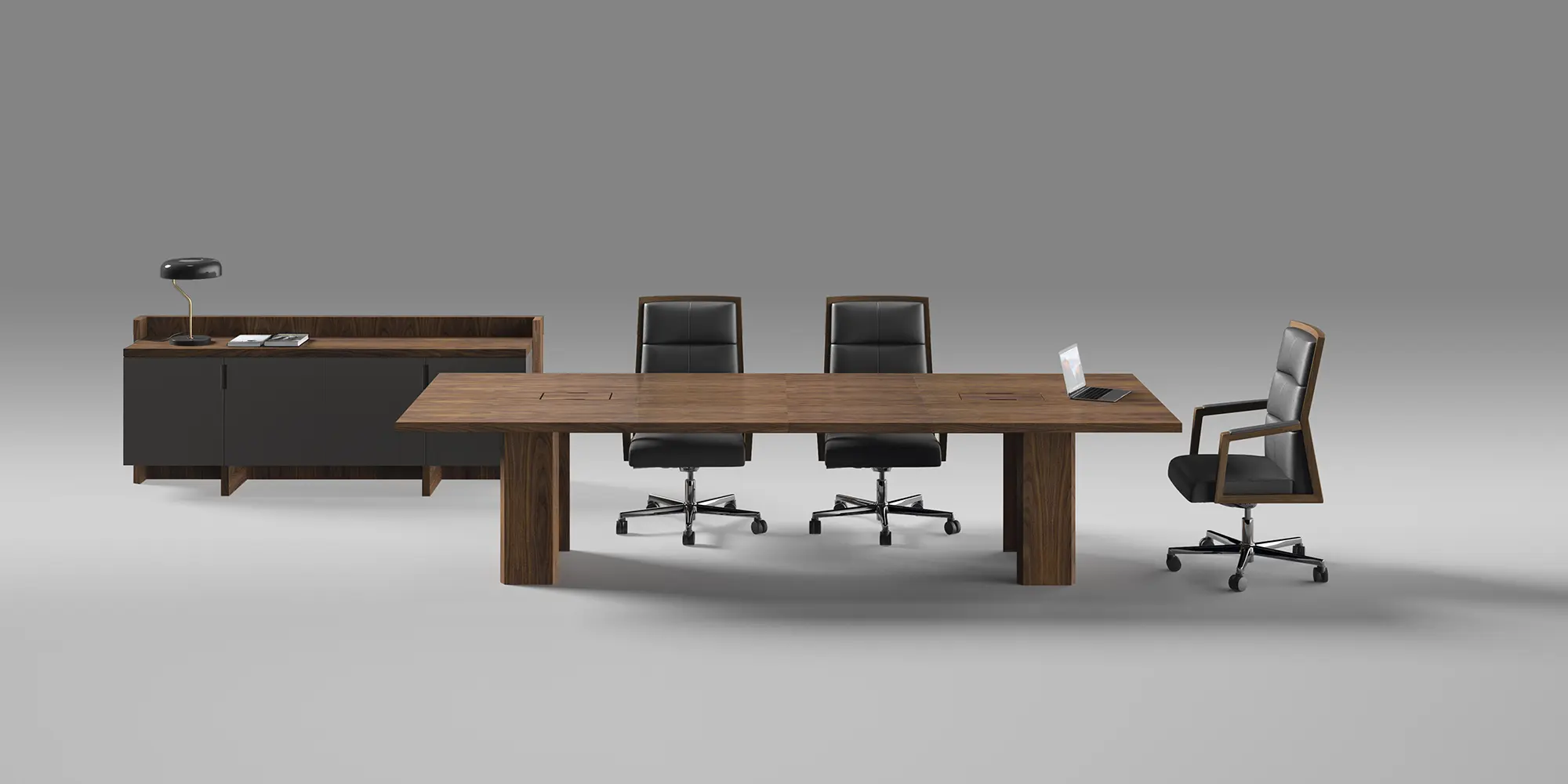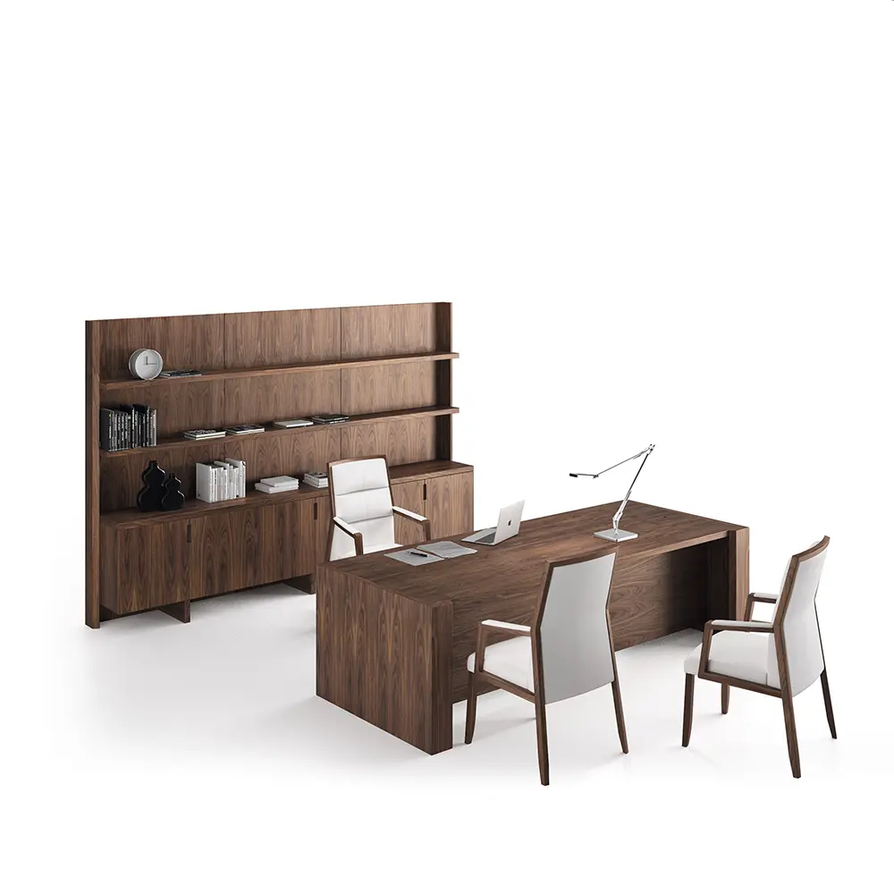 - Cuerpo realizado con tablero de fibras de 655 kg/m3 de MDF de 40 mm de espesor y chapa natural de nogal americano, los cantos están chapados con canto de madera de nogal americano de 2 mm.